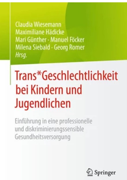 Möller, B., Güldenring, A., Wiesemann, C., & Romer, G. (2018). Geschlechtsdysphorie im Kindes- und Jugendalter: Behandlung und Entwicklungsförderung im Spannungsfeld von gesellschaftlichen Kontroversen, Wertewandel und Kindeswohl. Kinderanalyse, 26(3), 228-263. Wiesemann, C. (2020). Trans-Identität bei Kindern und Jugendlichen: Medizinethische Grundsätze für individuelle Behandlungsentscheidungen. Praxis der Kinderpsychologie und Kinderpsychiatrie, 69(6), 517-523.
